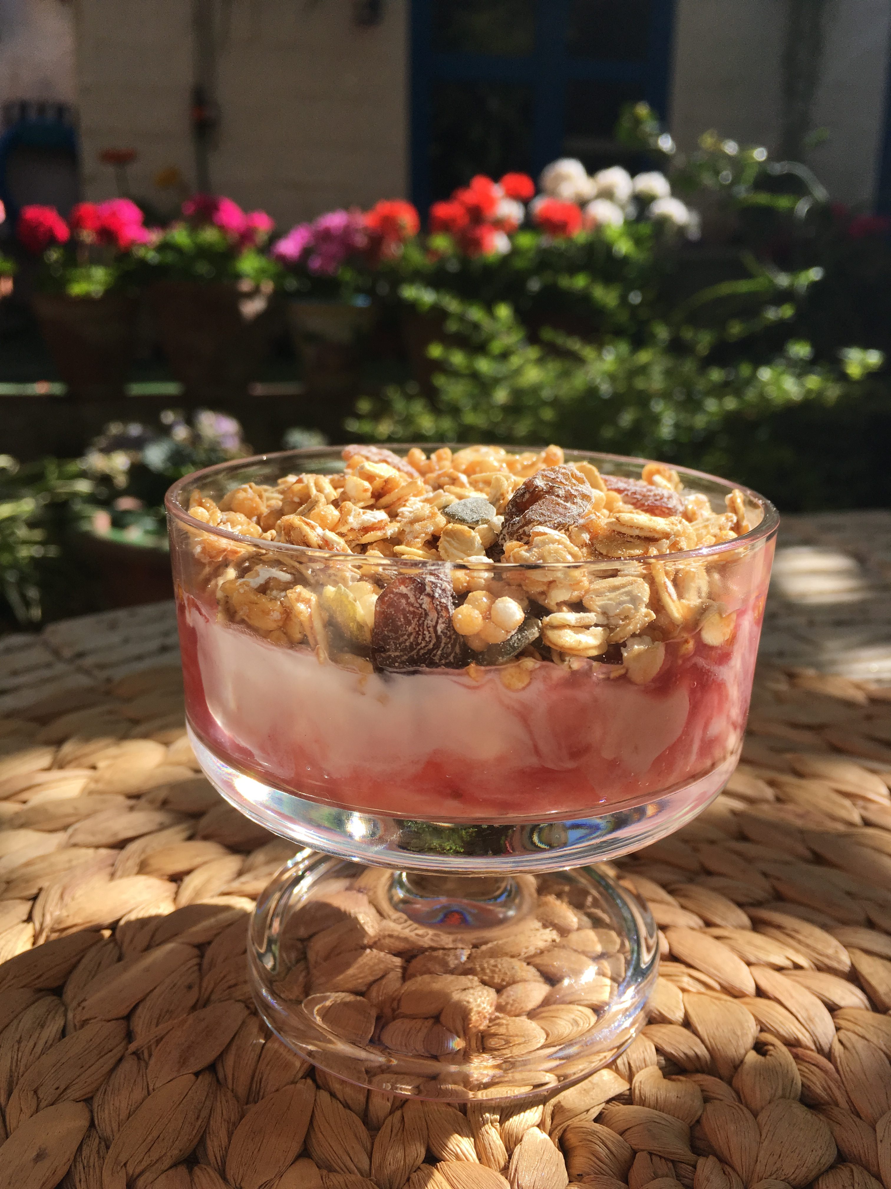 - Queso fresco con cereales de desayuno y con fresas y moras.