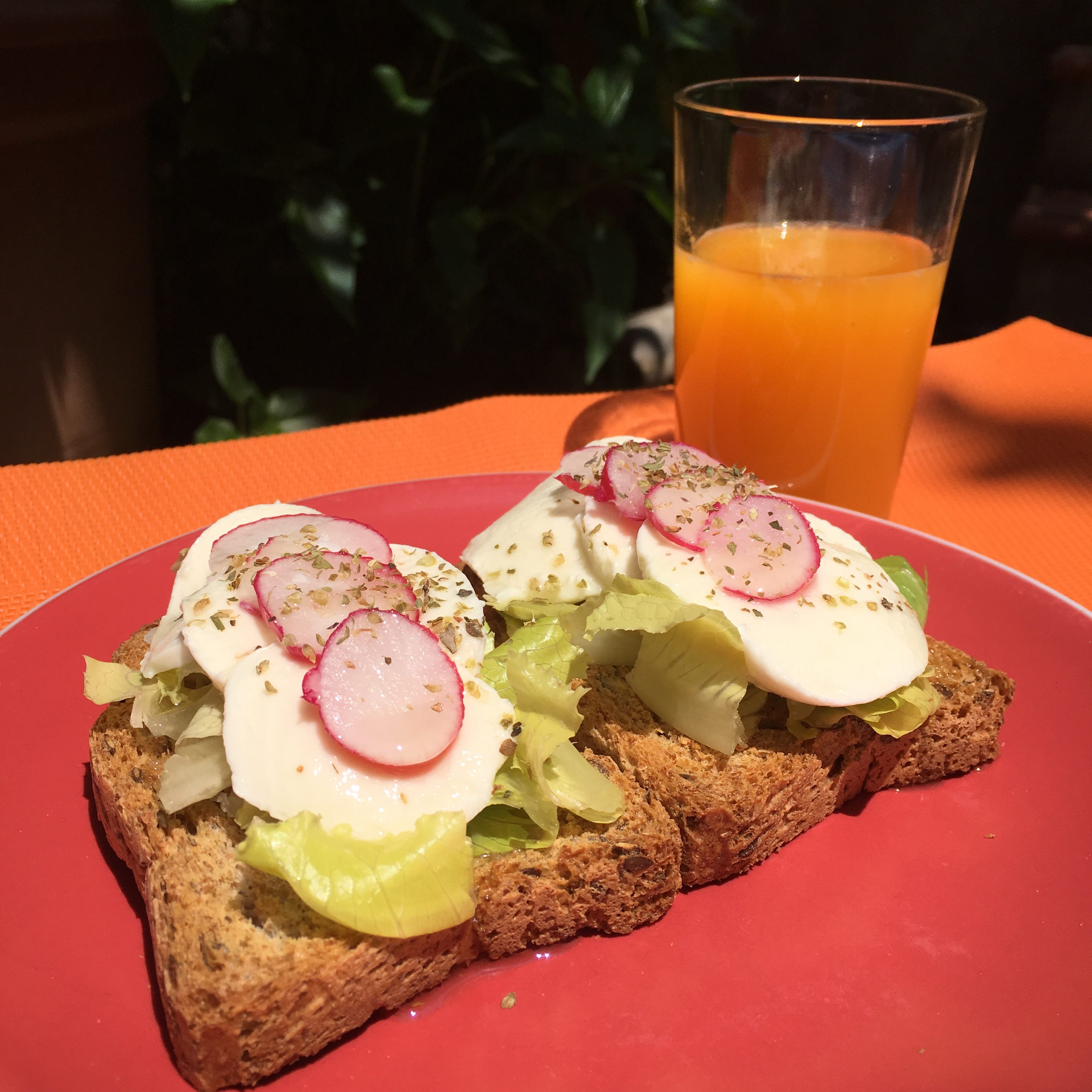 - Tostada integral con crema de queso, frambuesas y albahaca