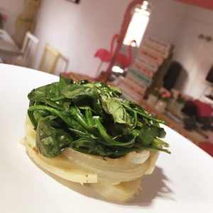 - Bajar la temperatura a 180ºC y poner las espinacas tiernas por encima de las patatas y dejar otros 5 minutos más. Antes de este paso, prefiero pinchar las patatas con un tenedor para asegurarme de que están tiernas, ya que alguna vez me han quedado un poco crudas.